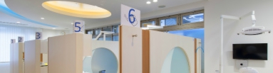1階はチェア5台の診察室 2階は個室診察4室 衛生士さんのブラッシング指導や