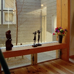 杉の無垢材を床に使い窓枠は建物の構造に使う梁材を使い絵画の額縁のようにしっかりしたフレームをつくりました。中庭の樹木が美しく見えるよう目線ははめ殺し窓にして足元から風を抜く工夫をしています。しっかりした枠は天板にもなりアート作品が美しく飾られています。