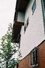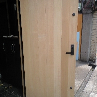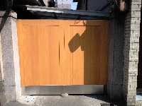 Tさんのお宅では外壁のリフォームと合わせて昔ながらのつくり方で玄関扉、ガラリ雨戸、両開き門扉を米桧の無垢材を使って作り直しました。