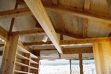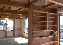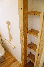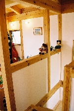 吉野杉をふんだんに使ったナチュラルな住まいです。棚や手すり、家具もリーズナブルな節のある杉板で製作、気持ちのやすらぐ住まいになりました。