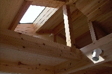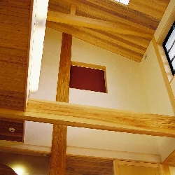 欅の無垢大黒柱 天井は桧の無垢板を使った気持ちの良い大空間の吹き抜けです。