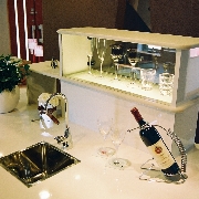 パンをこねるための作業台を人工大理石で内部に既存のテーブルをスライドで仕込みます。食器棚はスチーマーやオーブンをビルトインしてすっきり収納の完成です。