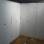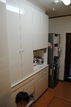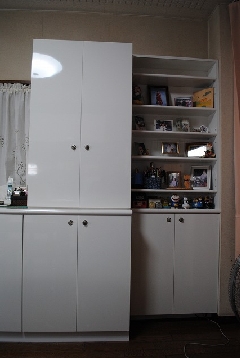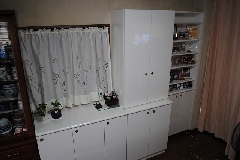 子供さんの独立を機会に家の中をすっきりとリフォーム中のTさん、ペットの犬のことも配慮してメラミン化粧板で壁面収納です。