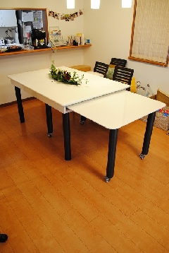 ゆったりリビングのリフォームの第1歩 たくさんで食事できるビッグダイニングテーブルをアイカバリューエッジで製作中です